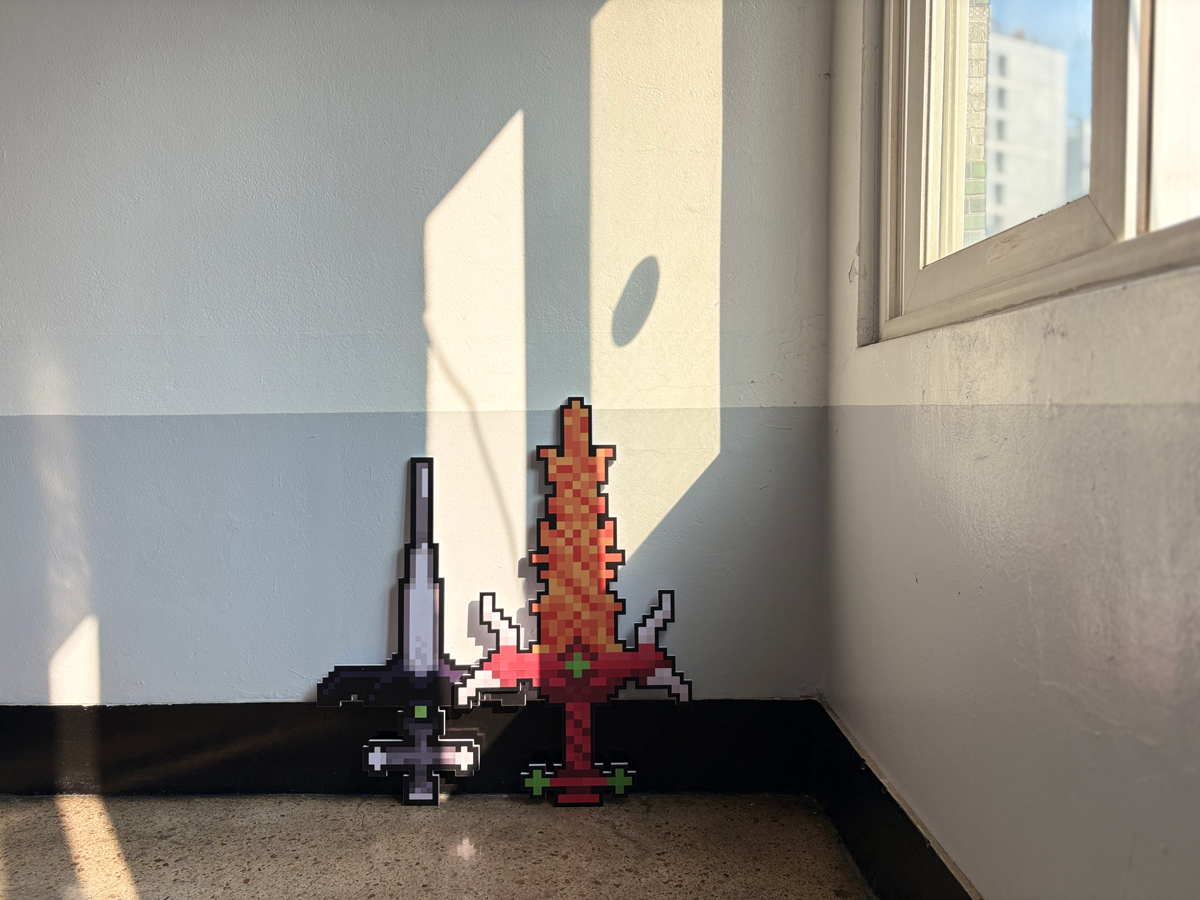 화랑 작가가 어린 시절 마인크래프트에서 처음 만난 픽셀을 설명한 말입니다. 그때는 단순한 게임 속 블록일 뿐이었지만, 지금 돌이켜보면 그것이 자신의 모습과 닮아 있었다고 해요. ![]() 병으로 인해 기존의 재료를 포기해야 했을 때, 그는 대신 포맥스라는 비주류 재료를 택해 픽셀 작업을 시작했습니다. 그의 전작 <메디키트>는 치유에 대한 간절함을 담았고, <불씨>는 현실과 부딪히며 수용하고 나아가는 과정을 보여주었습니다.